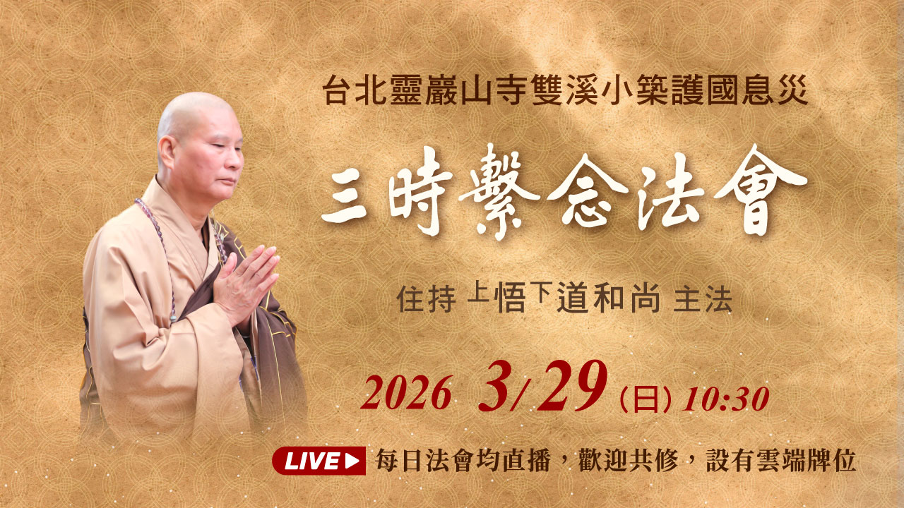 法會通告 報名資訊 雲端牌位 東林念佛堂 最新訊息 3/29直播|護國息災三時繫念法會 悟道法師親自主法,誠摯邀請十方大德同共發心,線上共修,同霑法益。 2026 年 3 月 16 日 精選影片 看別人受苦,為何自己也覺得痛?|淨空老法師答疑 問:每次到醫院做化療,當他見到其他病患受苦時,自己會感到更痛…… 2026 年 3 月 15 日 精選影片 勸人要用智慧|悟道法師開示 在勸諫的方面也是要有善巧方便,勸人不容易…… 2026 年 3 月 14 日 每日直播|護國息災百七繫念法會 【大陸同修點此處前往本站直播台】 人身難得,佛法難聞,要掌握住緣,認真修行 淨空老和尚開示:人身難得,真難得;佛法難聞,真難聞,得人身聞佛法,這大幸,緣成熟了。這個緣要是掌握住,認真修行,信願持名,求生淨土,就成佛,功德就圓滿了。 聽經聞法 三時繫念精華開示 三時繫念效果有多大?都在人心,不在法本。中峰禪師編的這個法本,法本是個引導而已,我們用真誠心去做、恭敬心去做、大慈悲心去做,就有不可思議的感應。 三時繫念精華今天學佛哪個人是為生死無常來修行的?古人確是!出家修道為什麼?為生死大事。現在人把這樁事情忘得乾乾淨淨,值得深深反省。 觀看影片 三時繫念精華開示許多人把這一句阿彌陀佛忽略了,認為這很普通不希奇,三歲小孩也會念,老太婆也會念,南無阿彌陀佛有什麼希奇!真的不希奇。 觀看影片 為什麼要舉辦護國息災三時繫念法會 ➊ 淨空老和尚開示百七繫念對於止息減輕災難,具有不可思議功德!➋ 全球人類不識道德,不知修善,感召全球氣候不正常空氣、糧食減產、水、食物受到嚴重汙染,天災人禍等大災難,若稍留意報章雜誌媒體報導,世界各地大小災難越來越頻繁,這些都是重大災難來臨的預兆。➌ 要作七個百七繫念護國息災恭請大家繼續共同發心,護持百七繫念法會,功德無量!